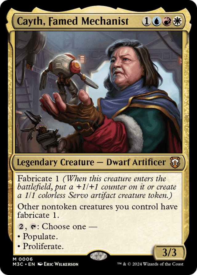 Any "as [this creature] enters the battlefield" or "[this creature] enters the battlefield with" abilities of the new token will work. — Fabricate doesn't cause the creature with the ability to enter the battlefield with +1/+1 counters already on it. For example, Cayth, Famed Machinist will enter the battlefield as a 3/3 creature, then its fabricate ability goes on the stack. Players may take actions (such as casting instants) while the ability is waiting to resolve. — If a player or permanent has more than one kind of counter on it, and you choose for it to get additional counters, it must get one of each kind of counter it already has. You can't have it get just one kind of counter it already has and not the others. — If you can't put a +1/+1 counter on the creature for any reason as fabricate resolves (for instance, if it's no longer on the battlefield), you just create a Servo token. — If you control no creature tokens when you populate, nothing will happen. — Players can respond to a spell or ability whose effect includes proliferating. Once that spell or ability starts to resolve, however, and its controller chooses which permanents and players will get new counters, it's too late for anyone to respond. — The new creature token copies the characteristics of the original token as stated by the effect that created the original token. — The new token doesn't copy whether the original token is tapped or untapped, whether it has any counters on it or Auras and Equipment attached to it, or any non-copy effects that have changed its power, toughness, color, and so on. — When you proliferate, you can choose any permanent that has a counter, including ones controlled by opponents. You can choose any player who has a counter, including opponents. You can't choose cards in any zone other than the battlefield, even if they have counters on them. — You choose whether to put a +1/+1 counter on the creature or create a Servo token as the fabricate ability is resolving. No player may take actions between the time you choose and the time that the counter is added or the token is created. — You don't have to choose every permanent or player that has a counter—only the ones you want to add counters to. Since "any number" includes zero, you don't have to choose any permanents at all, and you don't have to choose any players at all.