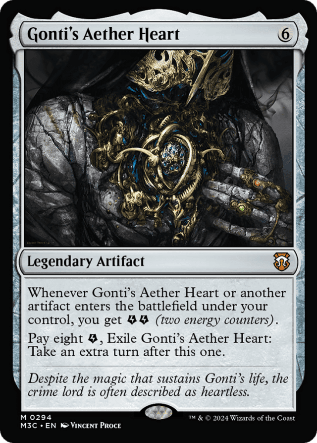 Whenever Gonti's Aether Heart or another artifact you control enters, you get {E}{E} (two energy counters). Pay eight {E}, Exile Gonti's Aether Heart: Take an extra turn after this one.