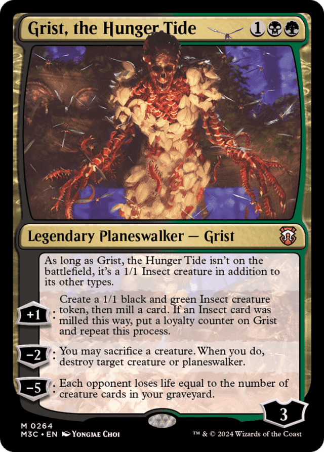As long as Grist isn't on the battlefield, it's a 1/1 Insect creature in addition to its other types. [+1]: Create a 1/1 black and green Insect creature token, then mill a card. If an Insect card was milled this way, put a loyalty counter on Grist and repeat this process. [−2]: You may sacrifice a creature. When you do, destroy target creature or planeswalker. [−5]: Each opponent loses life equal to the number of creature cards in your graveyard.