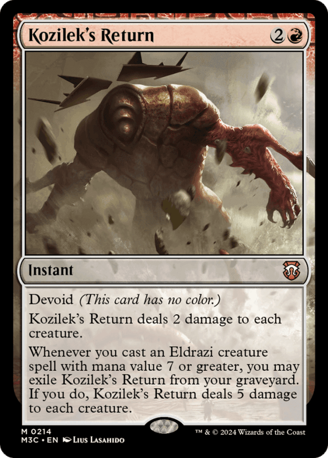 Devoid (This card has no color.) Kozilek's Return deals 2 damage to each creature. Whenever you cast an Eldrazi creature spell with mana value 7 or greater, you may exile this card from your graveyard. If you do, this card deals 5 damage to each creature.