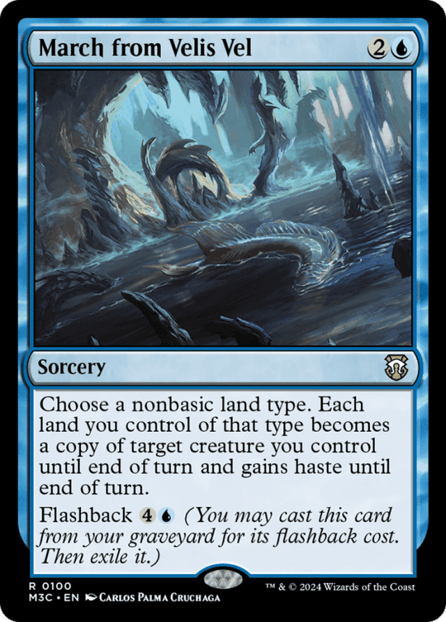 Choose a nonbasic land type. Each land you control of that type becomes a copy of target creature you control until end of turn and gains haste until end of turn. Flashback {4}{U} (You may cast this card from your graveyard for its flashback cost. Then exile it.)