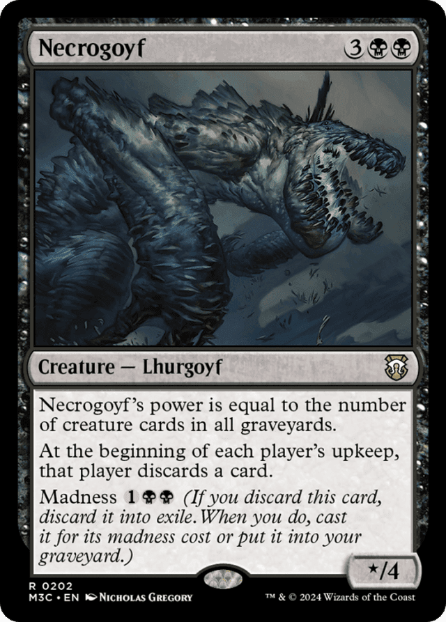 Necrogoyf's power is equal to the number of creature cards in all graveyards. At the beginning of each player's upkeep, that player discards a card. Madness {1}{B}{B} (If you discard this card, discard it into exile. When you do, cast it for its madness cost or put it into your graveyard.)
