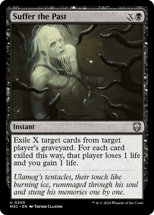 If the targeted player becomes an illegal target by the time Suffer the Past resolves but the targeted cards don’t, you still exile the cards and gain life. The player won’t be lose any life, though. — Suffer the Past’s effect causes a single life-gain event, not a number of separate ones. This matters for cards such as Cradle of Vitality. — The life that’s lost and the life that’s gained are based on the number of cards that are actually exiled, not on the value of X (in case any of the targeted cards somehow leave the graveyard in response and thus can’t be exiled this way).