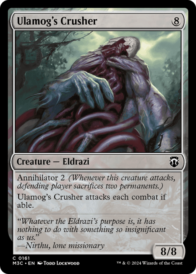 Annihilator 2 (Whenever this creature attacks, defending player sacrifices two permanents of their choice.) This creature attacks each combat if able.
