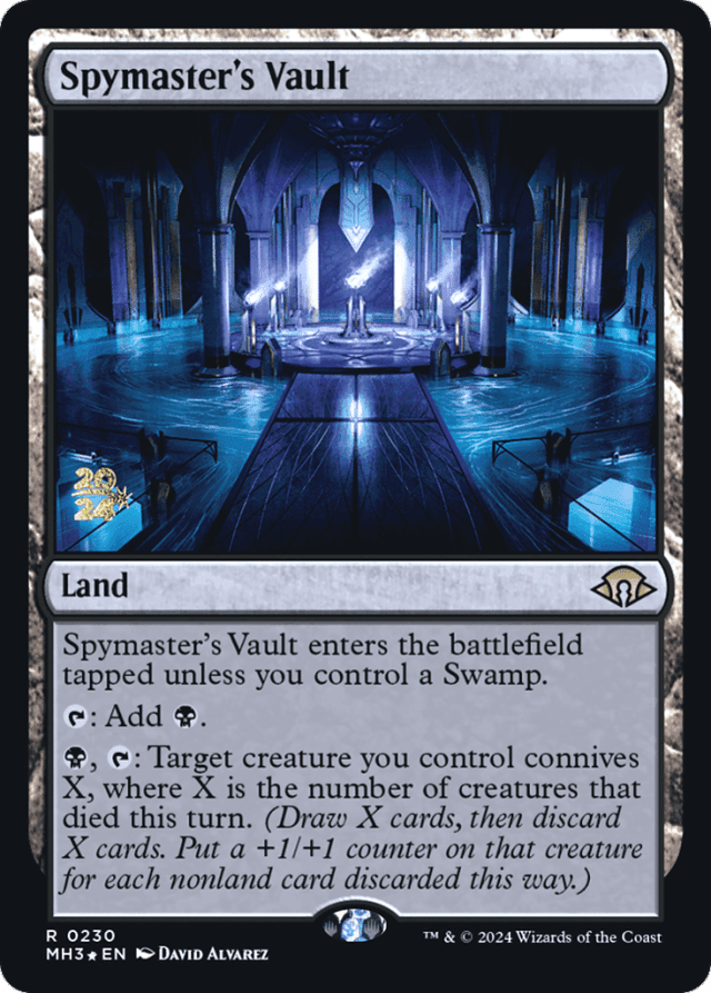 Connive X is a variant of connive. If a creature connives X, its controller will draw X cards, discard X cards, then then put a number of +1/+1 counters on the conniving permanent equal to the number of nonland cards discarded this way. — If a resolving spell or ability instructs a specific creature to connive but that creature has left the battlefield, the creature still connives, although you can't put any +1/+1 counters on it. Abilities that trigger "when [that creature] connives" will trigger. — If no cards are discarded, most likely because that player's hand is empty and an effect says they can't draw cards, the conniving creature does not receive any +1/+1 counters. — Once an ability that causes a creature to connive begins to resolve, no player may take any other actions until it's done. Notably, opponents can't try to remove the conniving creature after you discard cards but before it receives +1/+1 counters, if any. — You must already control a Swamp as Spymaster's Vault enters the battlefield for it to enter untapped. If it enters the battlefield at the same time as a Swamp when you control no other Swamps, it will enter tapped.