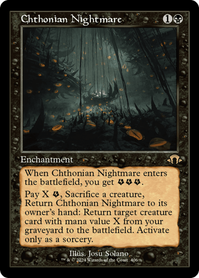 Chthonian Nightmare's last ability must have a target to be activated. You can't activate it without a target in order to return Chthonian Nightmare to your hand. — Energy counters are a kind of counter that a player may have. They're not associated with any specific permanents. — Energy counters aren't mana. They don't go away as steps, phases, and turns end, and effects that add mana "of any type" can't give you energy counters. — If a card in your graveyard has {X} in its mana cost, X is 0 when determining its mana value. — If a spell or ability with one or more targets states that you "may pay" some amount of {E}, and each permanent that it targets has become an illegal target, the spell or ability won't resolve. You can't pay any {E} even if you want to. — If an effect says you get one or more {E}, you get that many energy counters. To pay one or more {E}, you lose that many energy counters. You can't pay more energy counters than you have. Any effects that interact with counters a player gets, has, or loses can interact with energy counters. — Keep track of how many energy counters each player has. Potential ways to track this include writing theme down on paper or using dice, but any method that is clear and mutually agreeable is fine. (At higher levels of tournament play, dice may not be allowed for tracking counters that players have.) — Some spells and abilities that give you {E} may require targets. If each target chosen is an illegal target as that spell or ability tries to resolve, it won't resolve. You won't get any {E}. — Some triggered abilities state that you "may pay" a certain amount of {E}. You can't pay that amount multiple times to multiply the effect. You simply choose whether or not to pay that amount of {E} as the ability resolves. — Some triggered abilities that state that you "may pay" a certain amount of {E} describe an effect that happens "If you do." In that case, no player may take actions to try to stop the ability's effect after you make your choice. If the payment is followed by the phrase "When you do," then you'll choose any targets for that reflexive triggered ability and put it on the stack before players can take actions. — {E} is the energy symbol. It represents one energy counter.