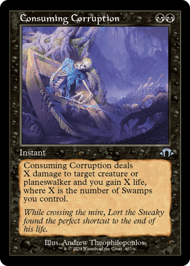 Consuming Corruption deals X damage to target creature or planeswalker and you gain X life, where X is the number of Swamps you control.