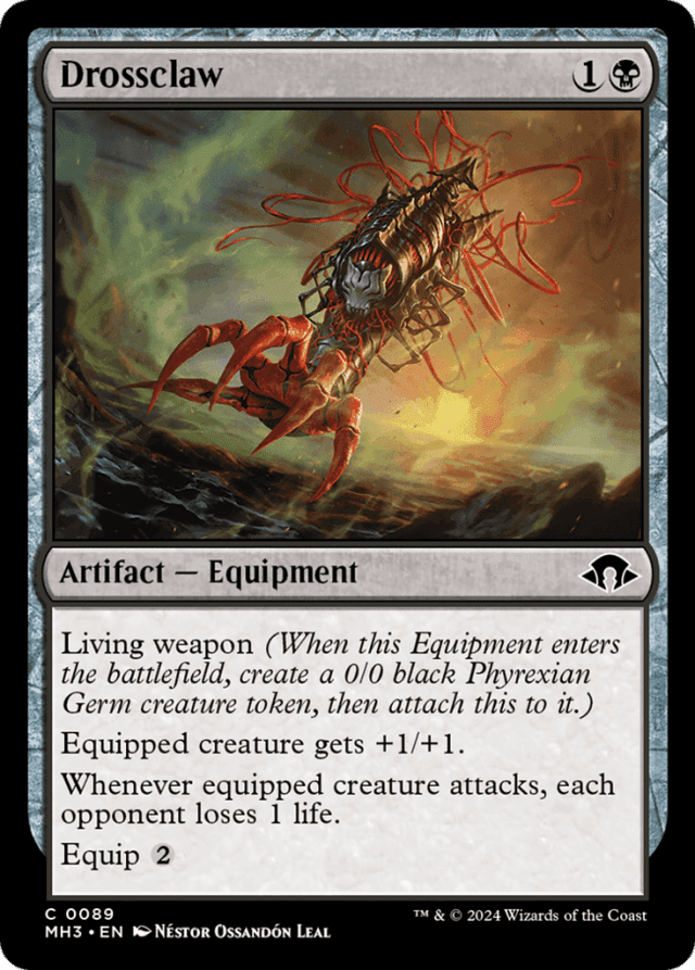 Living weapon (When this Equipment enters, create a 0/0 black Phyrexian Germ creature token, then attach this to it.) Equipped creature gets +1/+1. Whenever equipped creature attacks, each opponent loses 1 life. Equip {2}