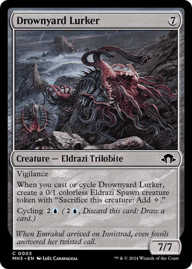Vigilance When you cast or cycle Drownyard Lurker, create a 0/1 colorless Eldrazi Spawn creature token with "Sacrifice this token: Add {C}." Cycling {2}{U} ({2}{U}, Discard this card: Draw a card.)