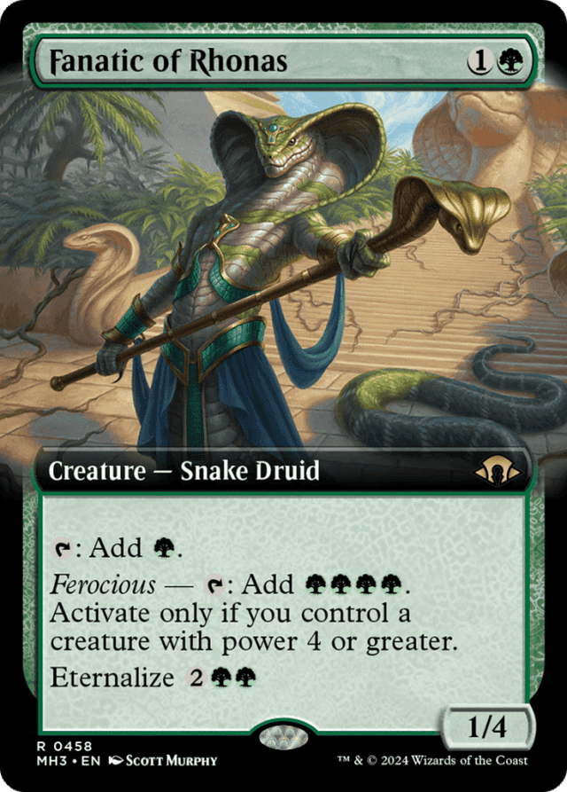 {T}: Add {G}. Ferocious — {T}: Add {G}{G}{G}{G}. Activate only if you control a creature with power 4 or greater. Eternalize {2}{G}{G} ({2}{G}{G}, Exile this card from your graveyard: Create a token that's a copy of it, except it's a 4/4 black Zombie Snake Druid with no mana cost. Eternalize only as a sorcery.)