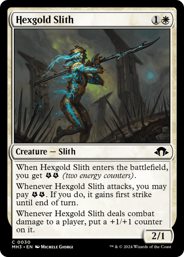 When this creature enters, you get {E}{E} (two energy counters). Whenever this creature attacks, you may pay {E}{E}. If you do, it gains first strike until end of turn. Whenever this creature deals combat damage to a player, put a +1/+1 counter on it.