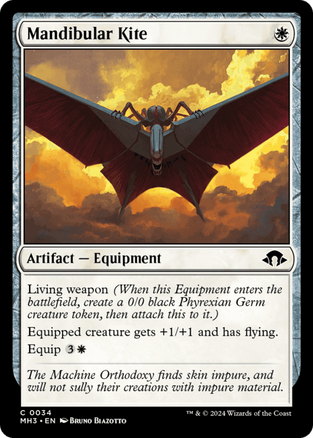 Living weapon (When this Equipment enters, create a 0/0 black Phyrexian Germ creature token, then attach this to it.) Equipped creature gets +1/+1 and has flying. Equip {3}{W}