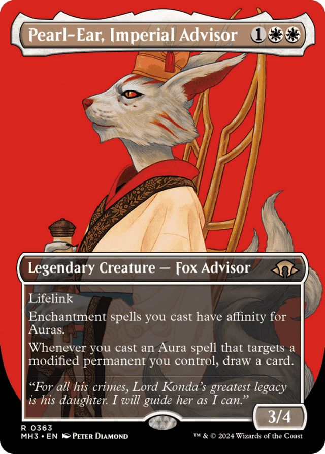 A creature that is equipped is considered modified no matter who controls the Equipment that's attached to it. — A creature with a counter on it is considered modified no matter what kind of counter it is or which player put it on that creature. — A creature you control that's the target of an Aura spell isn't modified unless it already has a counter on it, an Equipment attached to it, or an Aura you control attached to it. — An Aura controlled by another player does not cause a creature you control to be modified. — If a spell has multiple instances of affinity, each one applies. For example, if you somehow control two Pearl-Ear, Imperial Advisors and you control two Auras, each enchantment spell you cast will cost {4} less to cast. — If you put an Aura on an opponent's permanent, you still control the Aura, and it still counts for your spells that have affinity for Auras.