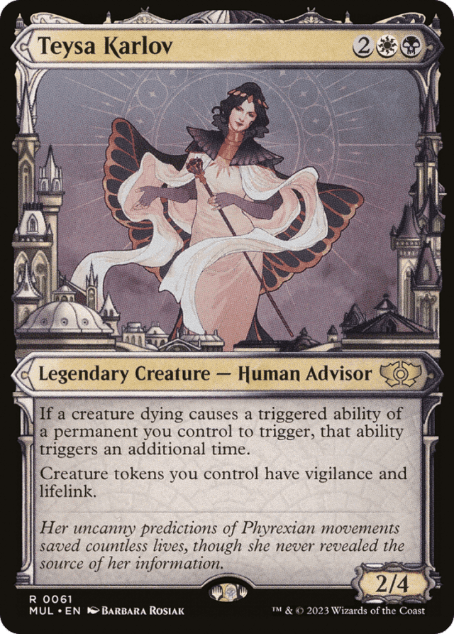 An ability of a permanent that triggers when a card is put into a graveyard “from anywhere” triggers twice only if Teysa and that permanent are both still on the battlefield immediately after the creature has died. — An ability that triggers on an event that causes a creature to die doesn't trigger twice. For example, an ability that triggers “whenever you sacrifice a creature” triggers only once. — An ability that triggers when a creature “leaves the battlefield” will trigger twice if that creature leaves the battlefield by dying. — If a creature dying at the same time as Teysa (including Teysa itself dying) causes a triggered ability of a permanent you control to trigger, that ability triggers an additional time. — If a creature dying at the same time that another permanent you control leaves the battlefield causes a triggered ability of that permanent to trigger, that ability triggers an additional time. — If you somehow control two Teysas, a creature dying causes abilities to trigger three times, not four. A third Teysa causes abilities to trigger four times, a fourth causes abilities to trigger five times, and so on. This also means that if you control Teysa and cast a second one, an ability that triggers when it dies due to the “legend rule” triggers three times. — Look at each creature as it exists on the battlefield, taking into account continuous effects, to determine whether any triggered abilities will trigger multiple times. For example, if a land that has become a creature dies, an ability that triggers when it dies triggers twice. — Teysa affects a creature's own “when this creature dies” triggered abilities as well as other triggered abilities that trigger when that creature dies. Such triggered abilities start with “when” or “whenever.” — Teysa's effect doesn't copy the triggered ability; it just causes the ability to trigger twice. Any choices made as you put the ability onto the stack, such as modes and targets, are made separately for each instance of the ability. Any choices made on resolution, such as whether to pay a cost for that triggered ability, are also made separately. — The trigger event doesn't have to specifically refer to “creatures.” In these cases, the trigger event may also refer to something being “put into a graveyard from the battlefield.” For example, an ability that triggers “whenever an artifact is put into a graveyard from the battlefield” would trigger twice if an artifact creature dies while Teysa Karlov is on the battlefield.