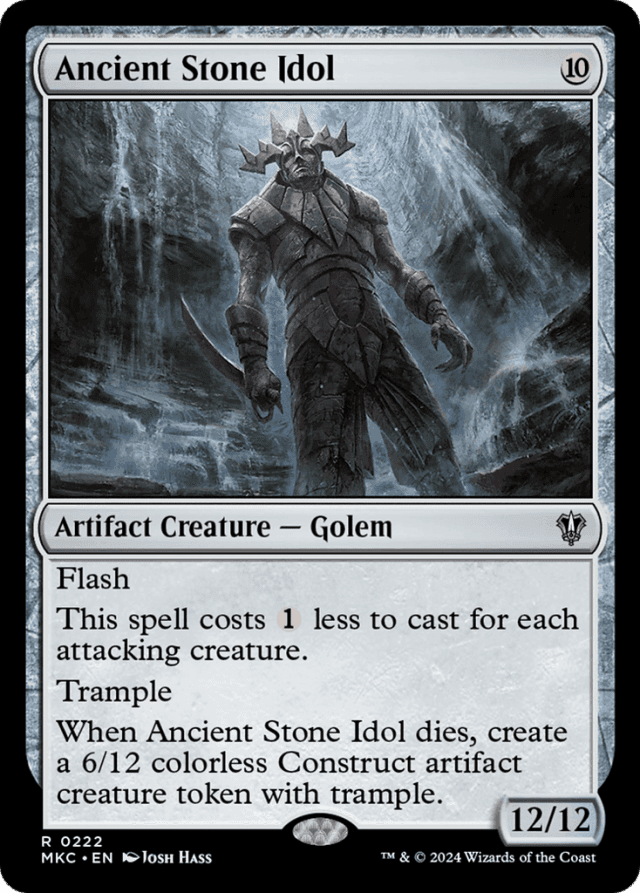 Ancient Stone Idol's cost is reduced for each attacking creature, not just creatures attacking you. It even counts your attacking creatures. — If there are enough attacking creatures, Ancient Stone Idol's cost can be reduced to {0}. — The total cost to cast a spell is locked in before you pay that cost. For example, if you control five attacking creatures, including one you can sacrifice to add {C}, Ancient Stone Idol costs {5} to cast. Then you can sacrifice the creature when you activate mana abilities just before paying the cost, and it still costs only {5} to cast.