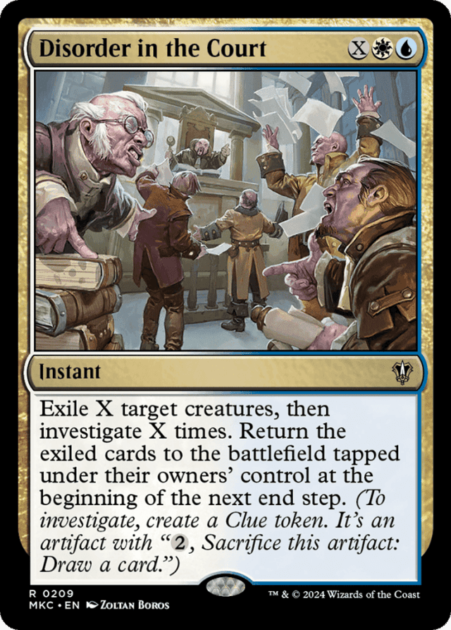 Exile X target creatures, then investigate X times. Return the exiled cards to the battlefield tapped under their owners' control at the beginning of the next end step. (To investigate, create a Clue token. It's an artifact with "{2}, Sacrifice this token: Draw a card.")