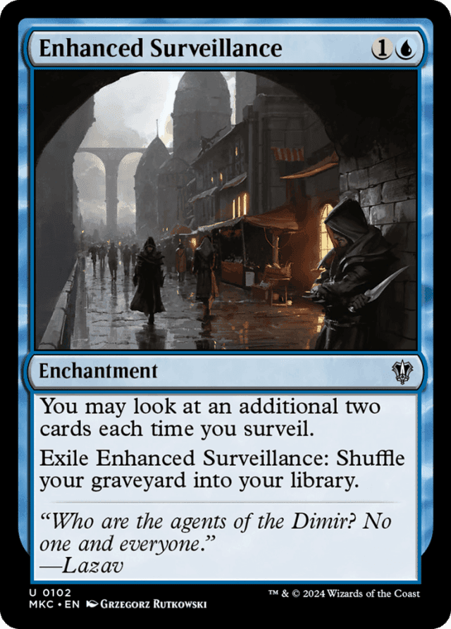Enhanced Surveillance's last ability can be activated only while it's on the battlefield. — If you control a second Enhanced Surveillance, their effects both apply and you may look at an additional four cards. If you control a third, may look at an additional six cards, and so on. — The additional cards you look at due to Enhanced Surveillance's ability are part of what you surveil. You may put those cards into your graveyard or back on top in any order along with the others.