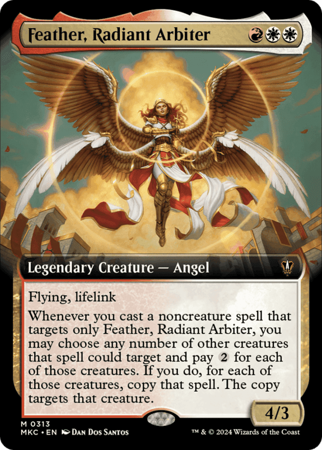 Flying, lifelink Whenever you cast a noncreature spell that targets only Feather, you may choose any number of other creatures that spell could target and pay {2} for each of those creatures. If you do, for each of those creatures, copy that spell. The copy targets that creature. (Copies of permanent spells become tokens.)