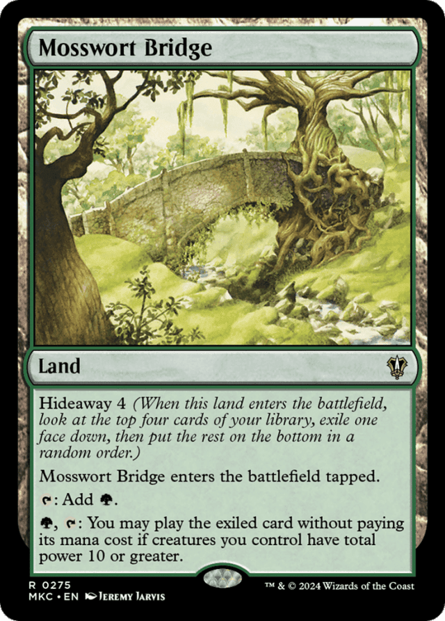 Hideaway 4 (When this land enters, look at the top four cards of your library, exile one face down, then put the rest on the bottom in a random order.) This land enters tapped. {T}: Add {G}. {G}, {T}: You may play the exiled card without paying its mana cost if creatures you control have total power 10 or greater.