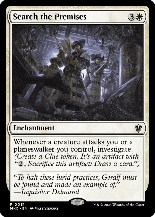 Whenever a creature attacks you or a planeswalker you control, investigate. (Create a Clue token. It's an artifact with "{2}, Sacrifice this token: Draw a card.")