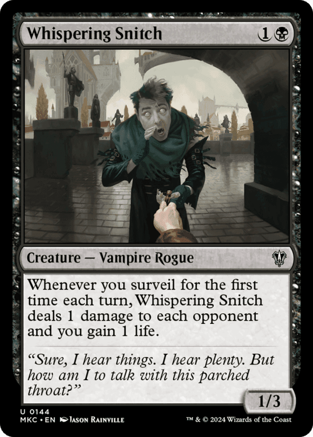 If you surveil before Whispering Snitch enters the battlefield, surveilling again during that turn won't cause its ability to trigger. — In a Two-Headed Giant game, Whispering Snitch's ability causes the opposing team to lose 2 life and you gain 1 life. — An ability that triggers "whenever you surveil" triggers after you're done surveilling, even if you have fewer cards in your library than the number of cards you're instructed to surveil. It even triggers if you have no cards in your library.