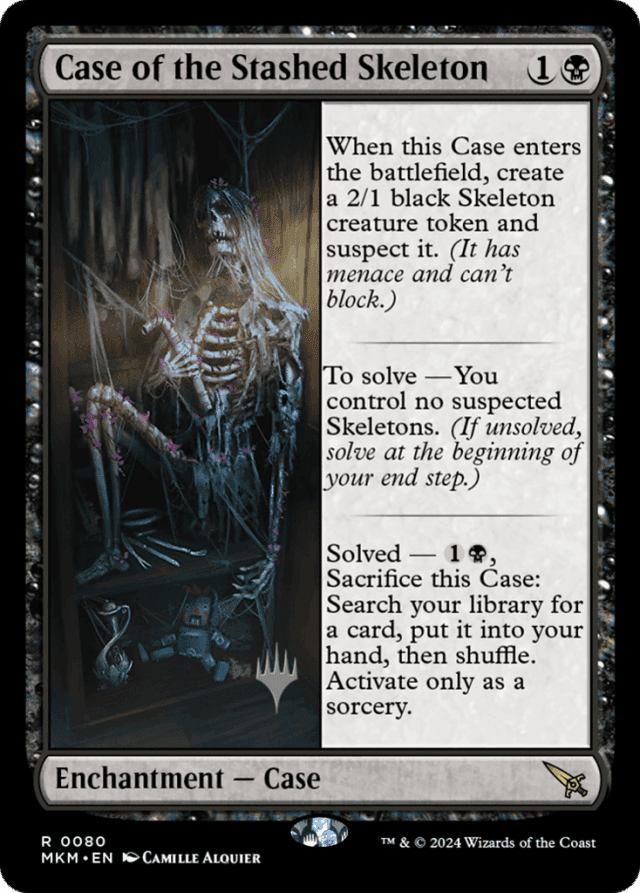 When this Case enters, create a 2/1 black Skeleton creature token and suspect it. (It has menace and can't block.) To solve — You control no suspected Skeletons. (If unsolved, solve at the beginning of your end step.) Solved — {1}{B}, Sacrifice this Case: Search your library for a card, put it into your hand, then shuffle. Activate only as a sorcery.