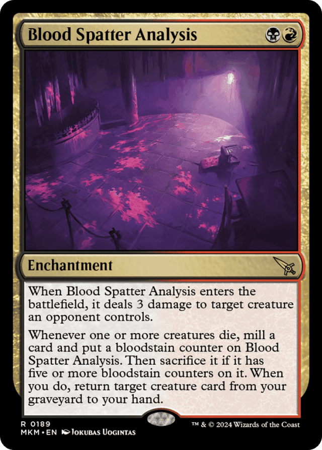 When this enchantment enters, it deals 3 damage to target creature an opponent controls. Whenever one or more creatures die, mill a card and put a bloodstain counter on this enchantment. Then sacrifice it if it has five or more bloodstain counters on it. When you do, return target creature card from your graveyard to your hand.