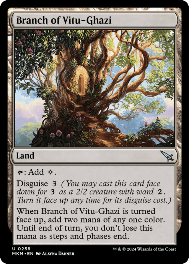 {T}: Add {C}. Disguise {3} (You may cast this card face down for {3} as a 2/2 creature with ward {2}. Turn it face up any time for its disguise cost.) When this land is turned face up, add two mana of any one color. Until end of turn, you don't lose this mana as steps and phases end.