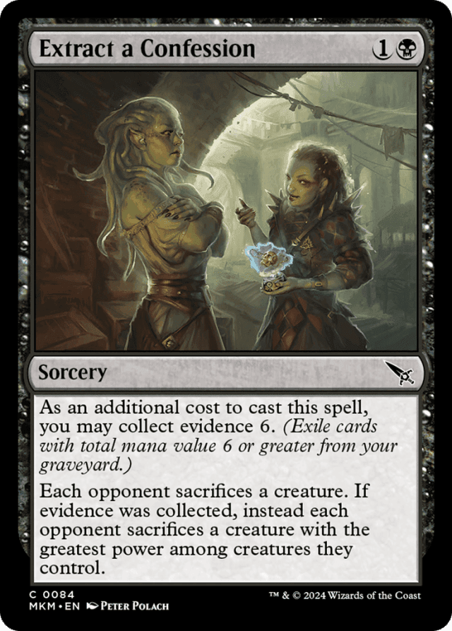 If evidence was collected and an opponent has multiple creatures tied for the greatest power, that player chooses which one to sacrifice. — If you can't exile enough cards to meet or exceed the required mana value, you can't choose to collect evidence at all. — Once you've announced that you're casting a spell, players can't take actions until you've finished doing so. Notably, opponents can't try to remove cards from your graveyard to stop you from collecting evidence. — Starting with the next opponent in turn order (or, if you cast Extract a Confession on an opponent's turn, starting with the opponent whose turn it is) and proceeding in turn order, each opponent chooses a creature they control to sacrifice. Then those creatures are sacrificed at the same time.
