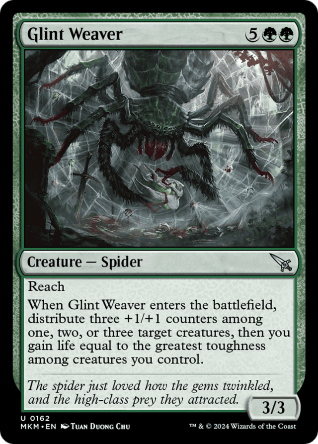 If some of the creatures are illegal targets as Glint Weaver's triggered ability tries to resolve, the original distribution of counters still applies and the counters that would have been put on the illegal targets are lost. — You choose how many targets Glint Weaver's triggered ability has and how the counters are distributed as you put the ability onto the stack. Each target must receive at least one counter.