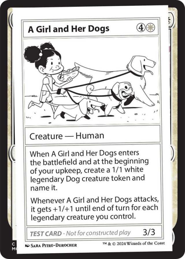 For many playtest cards, you’ll need to make a generous assumption that basic game rules would be updated to allow them to work. The Mystery Booster 2 Playtest Card Notes section (reproduced here in individual Gatherer rulings) provides guidance for fitting these cards into the existing rules structure. — Playtest cards aren’t legal for play in any tournament format other than Mystery Booster Limited formats. On the other hand, we expect they will spice up a wide variety of non-tournament games (as long as everyone’s on the same page about using them!). — Playtest cards use a modified version of game symbols, such as {T} and {W}. These modified symbols should be treated as the standard symbols during play. — Tokens created with A Girl and Her Dogs’s first ability are still subject to the “legend rule”, so be wary of giving two Dogs the same name or naming a Dog after an existing legendary Magic card. — You may give the Dog any name, including the name of an existing Magic card. Good names for Dogs include, but are not limited to: Booster, Bryn, Comet, Jasper, Killer, Pax, Pi, Ranger, Rocket, Sgt. Pepper, and Isamaru, Hound of Konda. (We thought you might need some suggestions to get you started.)