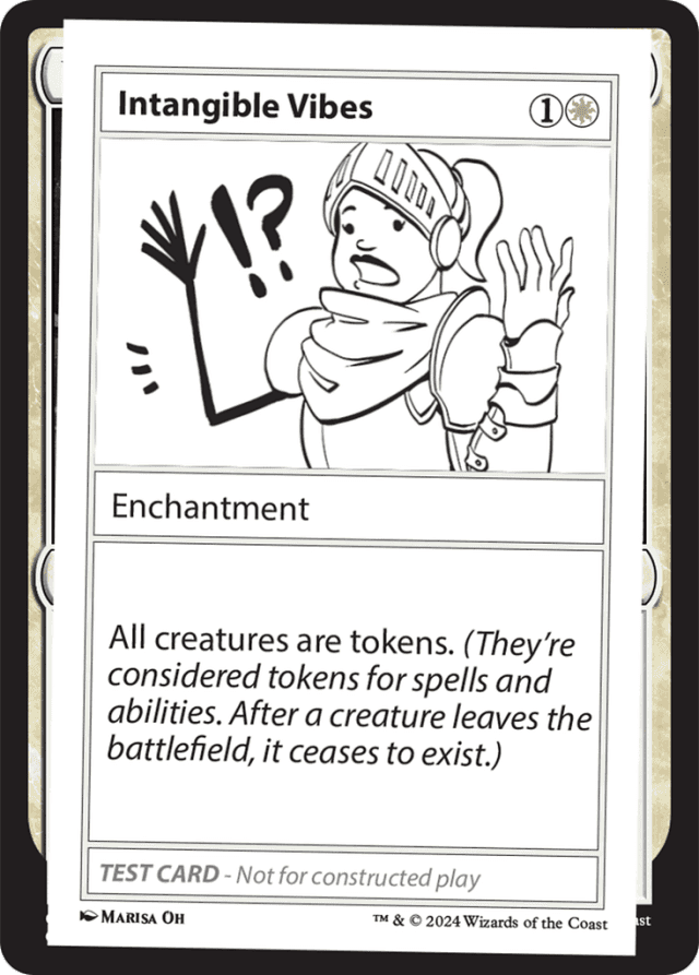 After a creature leaves the battlefield, it does briefly enter whatever zone it was put into before it ceases to exist. For example, a creature that’s put into a graveyard and then ceases to exist still triggers “Whenever a creature dies” abilities. — Creatures that cease to exist aren’t put into exile. They just stop existing. Put them somewhere separate so it’s clear they no longer exist. (I can’t help you with that existential conundrum—I’m just a humble rules person.) — For many playtest cards, you’ll need to make a generous assumption that basic game rules would be updated to allow them to work. The Mystery Booster 2 Playtest Card Notes section (reproduced here in individual Gatherer rulings) provides guidance for fitting these cards into the existing rules structure. — Playtest cards aren’t legal for play in any tournament format other than Mystery Booster Limited formats. On the other hand, we expect they will spice up a wide variety of non-tournament games (as long as everyone’s on the same page about using them!). — Playtest cards use a modified version of game symbols, such as {T} and {W}. These modified symbols should be treated as the standard symbols during play. — Tokens aren’t cards.