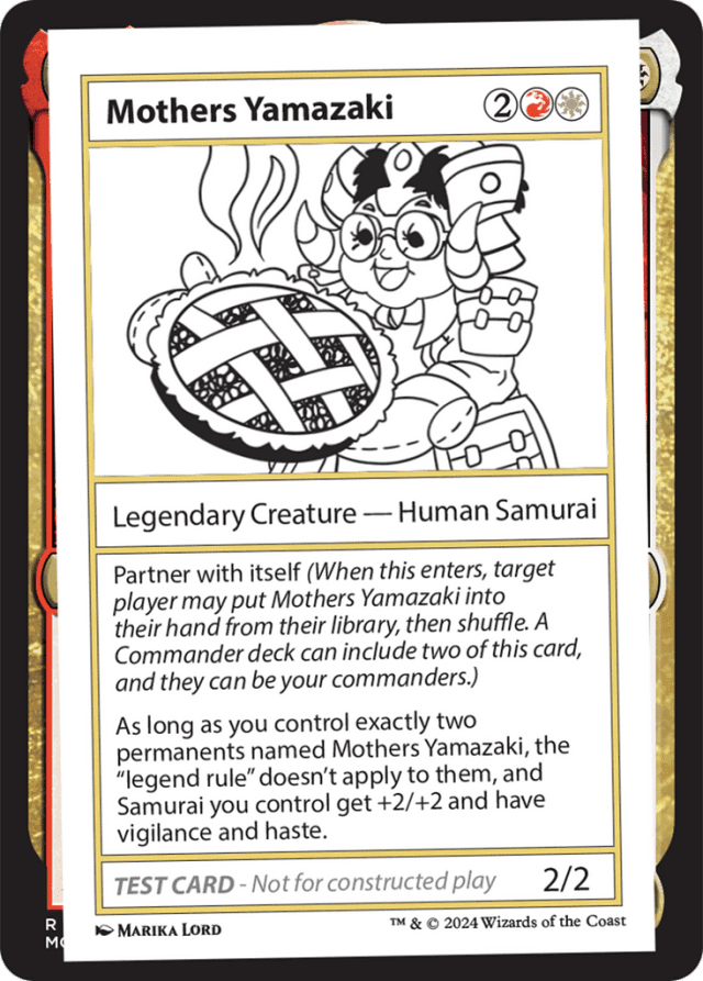 Partner with itself (When this enters, target player may put Mothers Yamazaki into their hand from their library, then shuffle. A Commander deck can include two of this card, and they can be your commanders.) As long as you control exactly two permanents named Mothers Yamazaki, the "legend rule" doesn't apply to them, and Samurai you control get +2/+2 and have vigilance and haste.