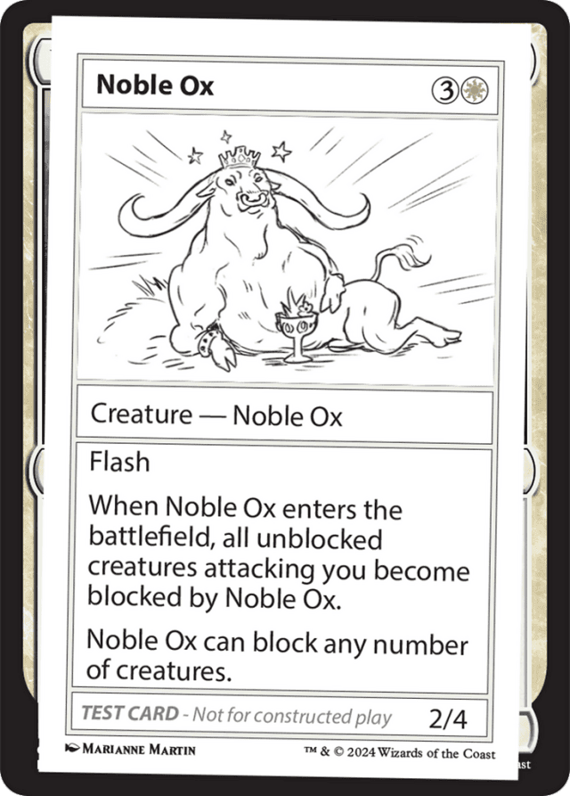 Attacking creatures are only considered unblocked after blockers have been declared. Before then, attacking creatures are neither blocked nor unblocked. — For many playtest cards, you’ll need to make a generous assumption that basic game rules would be updated to allow them to work. The Mystery Booster 2 Playtest Card Notes section (reproduced here in individual Gatherer rulings) provides guidance for fitting these cards into the existing rules structure. — Make sure to enunciate when you cast this. — Noble Ox’s enters-the-battlefield ability causes all unblocked creatures attacking you to become blocked by Noble Ox, regardless of whether Noble Ox can normally block that creature. — Playtest cards aren’t legal for play in any tournament format other than Mystery Booster Limited formats. On the other hand, we expect they will spice up a wide variety of non-tournament games (as long as everyone’s on the same page about using them!). — Playtest cards use a modified version of game symbols, such as {T} and {W}. These modified symbols should be treated as the standard symbols during play.