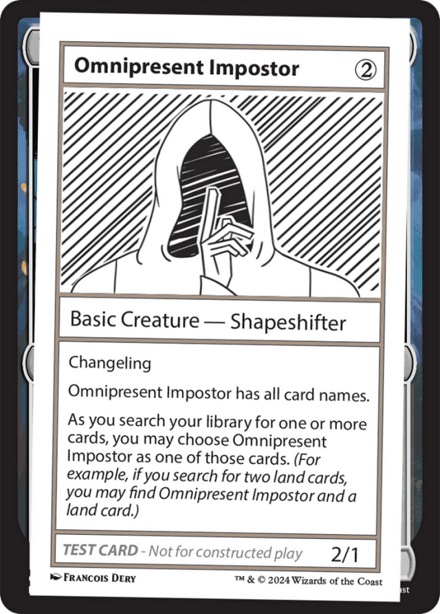 Each time you search your deck for one or more cards, you can find Omnipresent Impostor in place of one of those cards. If you search your deck for more than one card, you can replace each of those cards with an Omnipresent Impostor as long as there are enough Omnipresent Impostors in your deck. Continue resolving the search effect with Omnipresent Impostor in place of whatever card it replaced. For example, Sakura-Tribe Elder’s activated ability lets you put an Omnipresent Impostor onto the battlefield tapped, while Goblin Engineer’s enters ability lets you put an Omnipresent Impostor into your graveyard. — For many playtest cards, you’ll need to make a generous assumption that basic game rules would be updated to allow them to work. The Mystery Booster 2 Playtest Card Notes section (reproduced here in individual Gatherer rulings) provides guidance for fitting these cards into the existing rules structure. — Omnipresent Impostor has the basic supertype, and you can play as many of them as you want in your Constructed decks. These two statements may or may not be related. — Omnipresent Impostor has the names of all cards, including the back faces of double-faced cards. Notably, it doesn’t have the names of tokens, such as Zombie Token, Blood Token, and similar. — Omnipresent Impostor’s second ability is a characteristic-defining ability that functions in all zones as well as outside the game. — Playtest cards aren’t legal for play in any tournament format other than Mystery Booster Limited formats. On the other hand, we expect they will spice up a wide variety of non-tournament games (as long as everyone’s on the same page about using them!). — Playtest cards use a modified version of game symbols, such as {T} and {W}. These modified symbols should be treated as the standard symbols during play.