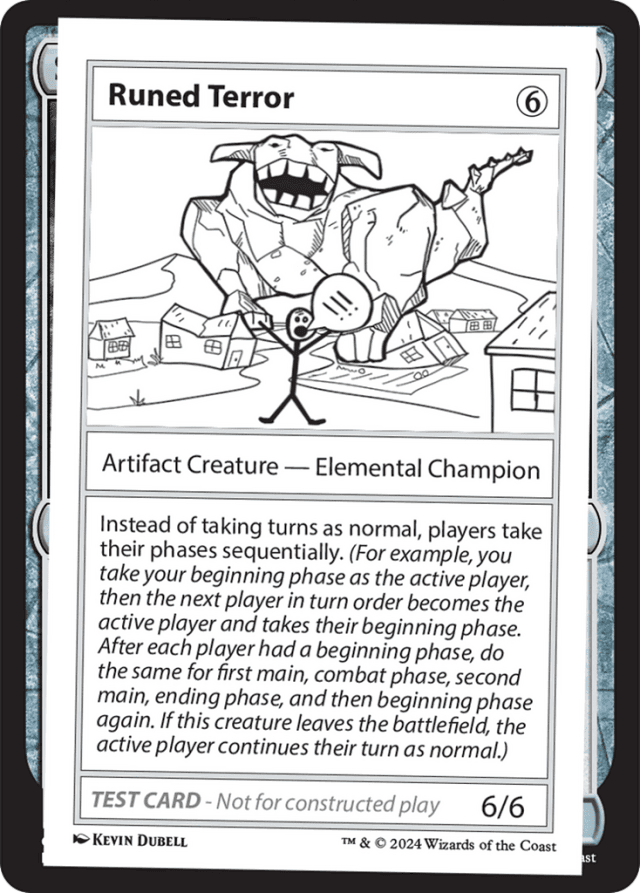 Effects that last “until end of turn” or apply “this turn” expire during the cleanup step of the player who was the active player when that effect began to apply. — For many playtest cards, you’ll need to make a generous assumption that basic game rules would be updated to allow them to work. The Mystery Booster 2 Playtest Card Notes section (reproduced here in individual Gatherer rulings) provides guidance for fitting these cards into the existing rules structure. — If an ability allows you to do something on or during “each of your turns”, that permission resets after your ending phase. For example, if you control Muldrotha, the Gravetide (“During each of your turns, you may play a land and cast a permanent spell of each permanent type from your graveyard”) and you cast a creature spell from your graveyard during your second main phase, you won’t be able to cast another creature spell from your graveyard with Muldrotha’s permission until after your next ending phase ends. — If an effect cares about whose turn it is, it’s the active player’s turn. — If there are multiple Runed Terrors on the battlefield, their abilities are mercifully redundant. — Playtest cards aren’t legal for play in any tournament format other than Mystery Booster Limited formats. On the other hand, we expect they will spice up a wide variety of non-tournament games (as long as everyone’s on the same page about using them!). — Playtest cards use a modified version of game symbols, such as {T} and {W}. These modified symbols should be treated as the standard symbols during play. — Steps in each phase play out as normal. For example, when you take your beginning phase, you’ll have an untap step, an upkeep step, and a draw step, and then the next player in turn order will take their beginning phase. — When the phase during which Runed Terror entered the battlefield ends, the next player in turn order will begin that same phase.