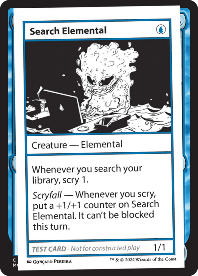 For many playtest cards, you’ll need to make a generous assumption that basic game rules would be updated to allow them to work. The Mystery Booster 2 Playtest Card Notes section (reproduced here in individual Gatherer rulings) provides guidance for fitting these cards into the existing rules structure. — Playtest cards aren’t legal for play in any tournament format other than Mystery Booster Limited formats. On the other hand, we expect they will spice up a wide variety of non-tournament games (as long as everyone’s on the same page about using them!). — Playtest cards use a modified version of game symbols, such as {T} and {W}. These modified symbols should be treated as the standard symbols during play. — Search Elemental doesn’t have a third ability as far as we can tell, but feel free to keep looking. — Search Elemental’s first ability won’t be put onto the stack until after the spell or ability that caused you to search your library finishes resolving. — Search Elemental’s second ability won’t be put onto the stack until after the spell or ability that caused you to scry finishes resolving.
