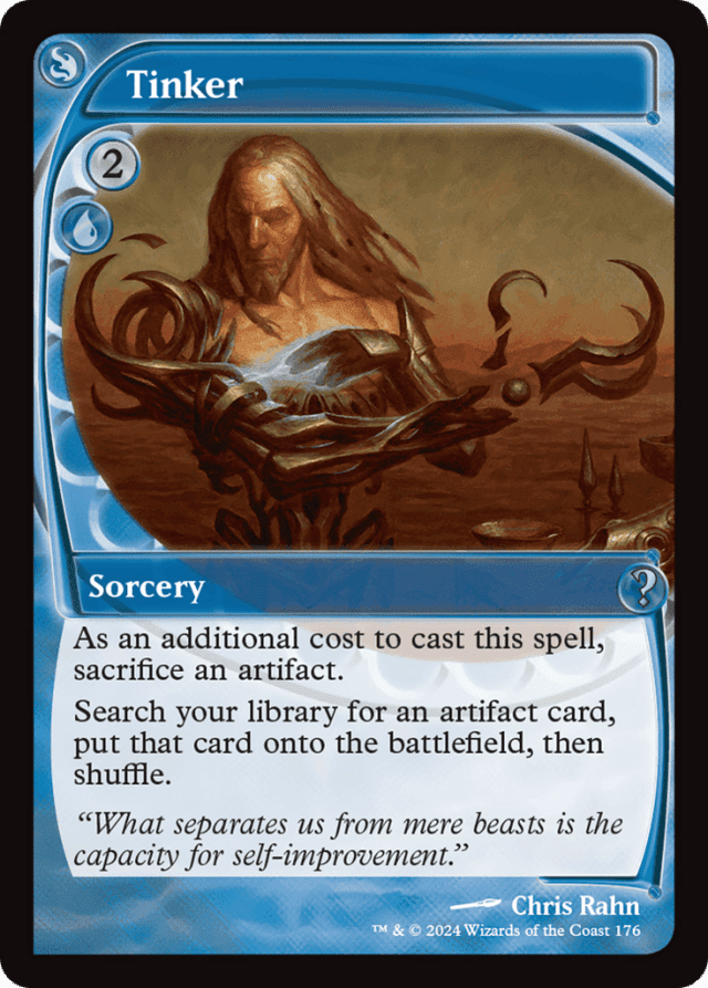 As an additional cost to cast this spell, sacrifice an artifact. Search your library for an artifact card, put that card onto the battlefield, then shuffle.