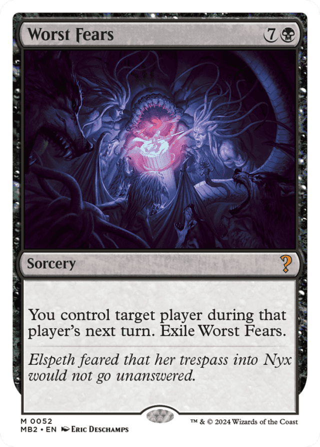 You control target player during that player's next turn. Exile Worst Fears. (You see all cards that player could see and make all decisions for the player.)