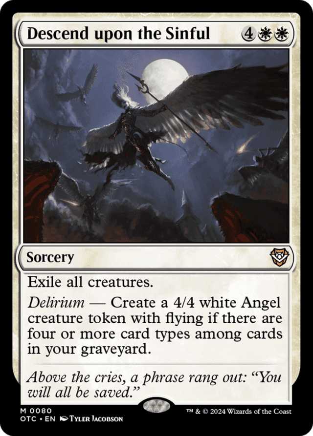 Because you consider only the characteristics of a double-faced card's front face while it's not on the battlefield, the types of its back face won't be counted for delirium. — If one of those creatures was enchanted, its Aura won't be put into a player's graveyard until after Descend upon the Sinful has finished resolving. If the controller of Descend upon the Sinful owned the Aura, it won't be in the graveyard in time to be counted for the delirium ability. — If you have three non-sorcery card types among cards in your graveyard at the time Descend upon the Sinful resolves, you won't get an Angel token. Descend upon the Sinful isn't put into your graveyard until after it's finished resolving. — In some rare cases, you can have a token or a copy of a spell in your graveyard at the moment that an object's delirium ability counts the card types among cards in your graveyard, before that token or copy ceases to exist. Because tokens and copies of spells are not cards, even if they are copies of cards, their types will never be counted. — The card types in Magic are artifact, battle, creature, enchantment, instant, kindred, land, planeswalker, and sorcery. Supertypes (such as legendary and basic) and subtypes (such as Human and Equipment) are not counted. — The number of card types matters, not the number of cards. For example, Wicker Witch (an artifact creature) along with Catalog (an instant) and Chaplain's Blessing (a sorcery) will enable delirium.