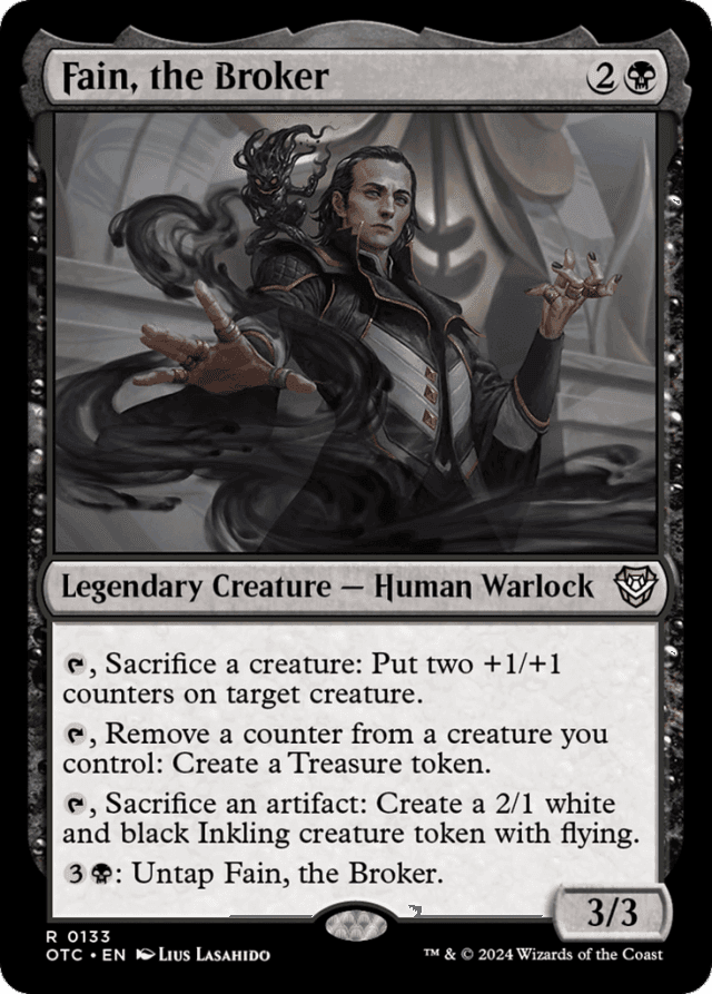 {T}, Sacrifice a creature: Put two +1/+1 counters on target creature. {T}, Remove a counter from a creature you control: Create a Treasure token. {T}, Sacrifice an artifact: Create a 2/1 white and black Inkling creature token with flying. {3}{B}: Untap Fain.