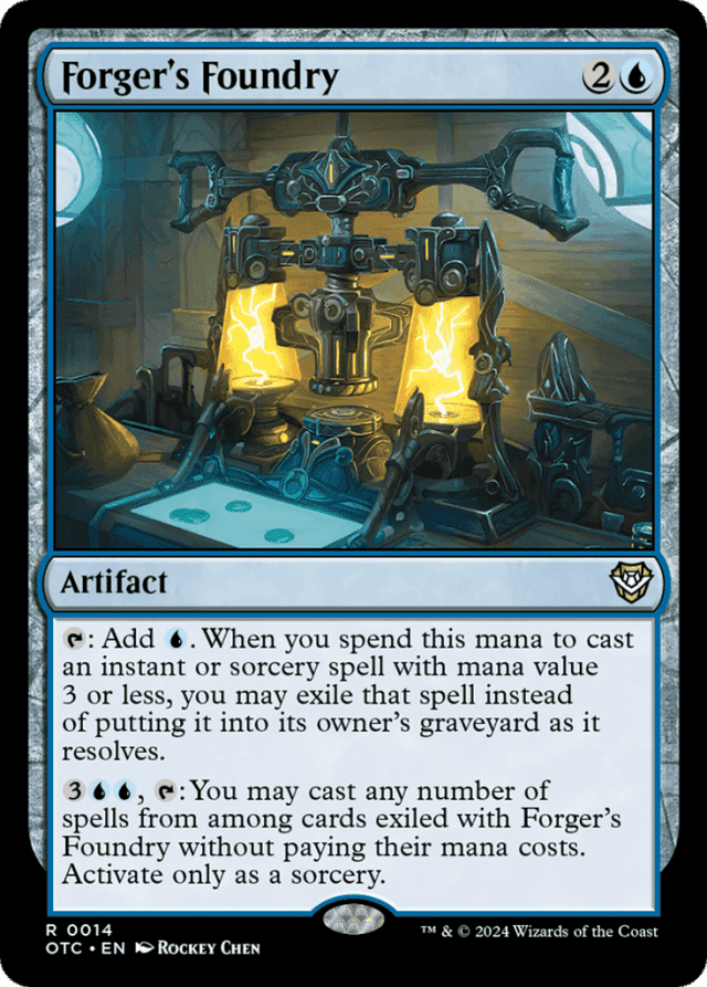 If a spell you cast has {X} in its mana cost, you must choose 0 as the value of X when casting it without paying its mana cost. — If you cast a spell "without paying its mana cost," you can't choose to cast it for any alternative costs. You can, however, pay additional costs, such as kicker costs. If the spell has any mandatory additional costs, those must be paid to cast the spell. — The delayed triggered ability will trigger whether Forger's Foundry is still on the battlefield or not. — The mana added by Forger's Foundry can be spent on anything, not just instant and sorcery spells with mana value 3 or less. — When casting an instant or sorcery spell with {X} in its mana cost using the mana added by Forger's Foundry, use the value of X chosen when you cast that spell to determine whether or not the delayed triggered ability triggers. — You cast the spells one at a time as Forger's Foundry's last ability is resolving, choosing modes, targets, and so on. The last spell you cast will be the first one to resolve. Ignore timing restrictions based on the cards' types. Other timing restrictions, such as "Cast [this spell] only during combat," must be followed. — You choose which spells (if any) to cast as Forger's Foundry's last ability resolves. If you do, you do so as part of the resolution of that ability. You can't wait to cast them later in the turn.