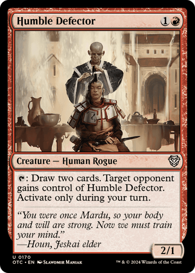 Humble Defector's ability can be activated any time during your turn, including in response to a spell or ability. — If Humble Defector is controlled by a player other than its owner, and its controller leaves the game, the effect giving that player control of Humble Defector ends. Humble Defector will return to the control of the player still in the game who most recently controlled it. — If Humble Defector isn't on the battlefield as its ability resolves, but the target player is still a legal target, the ability will resolve. You'll draw two cards, even though the player doesn't gain control of Humble Defector. — If Humble Defector's owner leaves the game, Humble Defector humbly leaves the game along with that player.