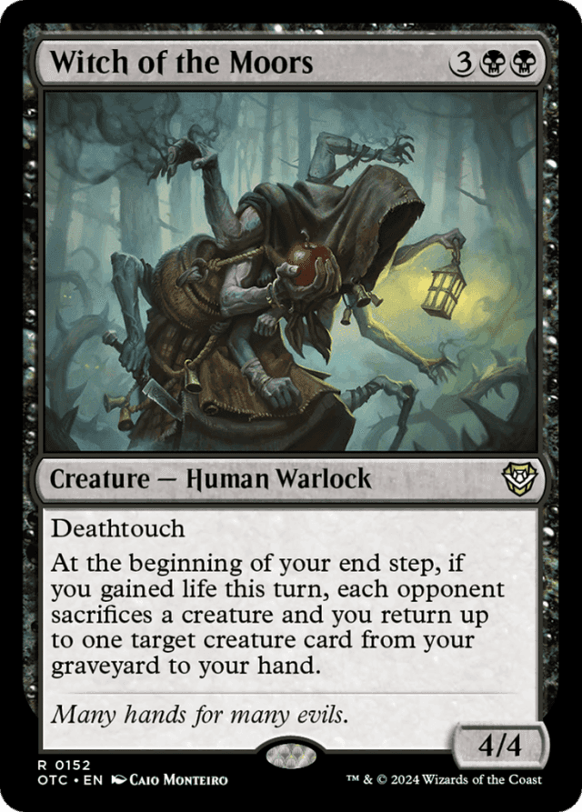 As the triggered ability resolves, first the next opponent in turn order chooses a creature they control, then each other opponent in turn order does the same knowing the choices made before them. Then all the chosen creatures are sacrificed at the same time. — If you haven't gained life by the time your end step begins, the triggered ability won't trigger at all. — The triggered ability looks at whether you've gained life in the turn, even if Witch of the Moors wasn't on the battlefield when you gained life. It doesn't care if you also lost life, even if you lost more life than you gained. — The triggered ability triggers just once, no matter how much life you've gained. — You don't have to choose a target creature card at all. If you do and the target card is an illegal target by the time the ability tries to resolve, the ability won't resolve. Your opponents won't sacrifice creatures.