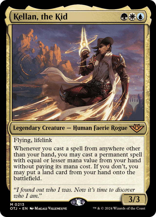A permanent spell is an artifact, battle, creature, enchantment, or planeswalker spell. — If the permanent spell you cast has {X} in its mana cost, you must choose 0 as the value of X when casting it without paying its mana cost. — If the spell you cast that caused Kellan, the Kid’s last ability to trigger has {X} in its mana cost, X is the value chosen as that spell was cast for the purpose of determining its mana value. — If the spell you cast that caused Kellan, the Kid’s last ability to trigger is represented by a split card, the characteristics of the half you didn’t cast are ignored while that spell is on the stack. For example, if you cast the Cease half of Cease // Desist from the Murders at Karlov Manor release, that spell’s mana value is 2 because Cease’s mana cost is {1}{B}{G}. — If you cast a spell “without paying its mana cost,” you can’t choose to cast it for any alternative costs. You can, however, pay additional costs, such as kicker costs. If the spell has any mandatory additional costs, those must be paid to cast the spell. — Putting a land card onto the battlefield with Kellan’s last ability doesn’t count as playing a land. It can put a land card onto the battlefield even if you’ve already played your land for the turn.