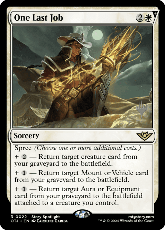 Each additional cost and associated mode in the text box is also preceded with a + indicator. These symbols also have no rules meaning and serve only to remind players that the listed costs are additional costs. — If a mode requires a target, you can select that mode only if there’s a legal target available. Ignore the targeting requirements for modes you don’t choose. — If a spell with spree is copied, the effect that creates the copy may allow you to choose new targets. You cannot choose new modes. — If all targets for the chosen modes become illegal before a spell with spree resolves, the spell won’t resolve and none of its effects will happen. If at least one target is still legal, the spell will resolve but will have no effect on any illegal targets. — If an effect allows you to cast a spell with spree “without paying its mana cost,” you must still choose at least one mode and pay the associated additional costs. — No matter which modes you choose, you always follow the instructions in the order they are written. — No player can cast spells or activate abilities in between the modes of a resolving spell. Any abilities that trigger won’t be put onto the stack until the spell is done resolving. — Spells with spree have a + (plus sign) indicator in the upper right corner of the card frame. This has no rules meaning and serves only to remind players that at least one additional cost is required to cast the spell. — The Aura or Equipment must be able to be legally attached to the creature you choose. You can’t return an Aura card to the battlefield if there’s nothing to enchant. However, if you control no creatures (and didn’t bring any back with the first two modes), you could return an Equipment card to the battlefield unattached to anything. — The creature that the Aura or Equipment card returned by the third mode will enter attached to isn’t a target of that mode and is chosen as One Last Job resolves. Notably, if you return a Vehicle with the second mode, you won’t have the opportunity to crew it before having to choose a creature for the third mode. In most cases, it won’t be a creature at that time. — The mana value of a spell with spree is determined only by its mana cost (in the upper right corner of the card). It doesn’t matter which modes you choose or which additional costs you pay, including any additional costs imposed by other effects. — You can’t choose the same mode more than once. — You choose the modes as you cast the spell with spree. Once modes are chosen, they can’t be changed. — You must choose at least one of the listed modes and pay its associated additional cost in order to cast a spell with spree.