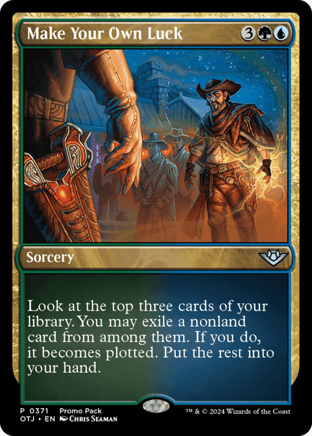 Look at the top three cards of your library. You may exile a nonland card from among them. If you do, it becomes plotted. Put the rest into your hand. (You may cast it as a sorcery on a later turn without paying its mana cost.)