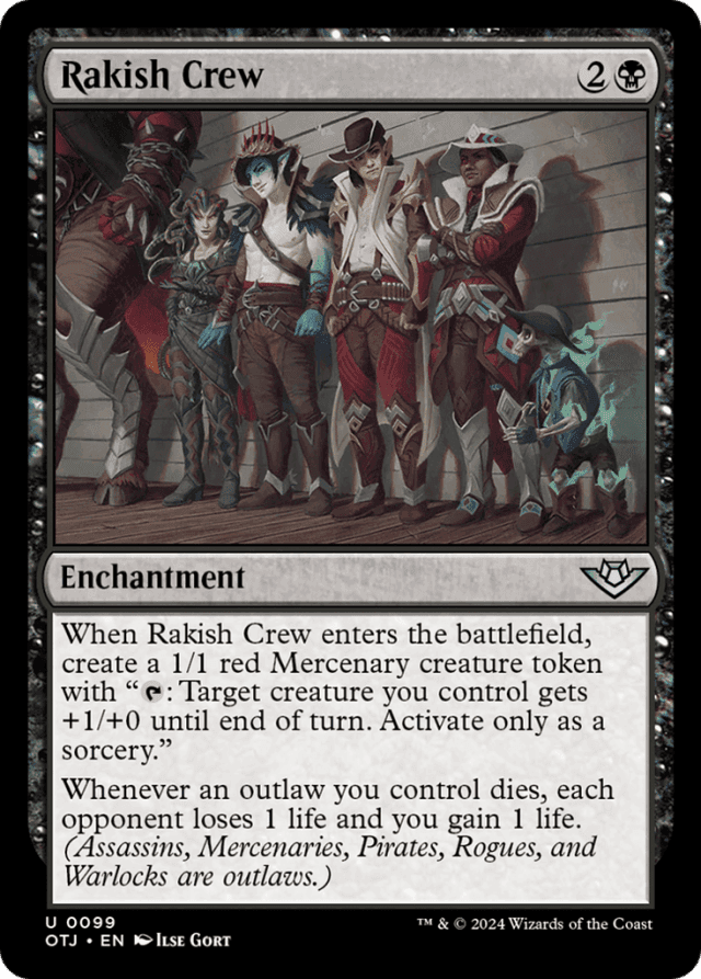 A card, spell, or permanent is an outlaw if it has the Assassin, Mercenary, Pirate, Rogue, or Warlock creature type. It doesn’t matter if it has more than one of those creature types; as long as it has at least one, it’s an outlaw. — If an ability refers to an outlaw or whether a player controls an outlaw, it’s referring only to permanents with one or more of the creature types specified above. Notably, it’s not referring to any spell or card not on the battlefield. However, other abilities may refer to an “outlaw spell” or “outlaw card” in a zone other than the battlefield. Those abilities refer to spells and cards with one or more of the specified creature types. — If one or more outlaws you control die at the same time that Rakish Crew leaves the battlefield, its last ability triggers for each of those outlaws. — Outlaw is not a creature type. If an effect asks you to choose a creature type, you can’t choose outlaw.