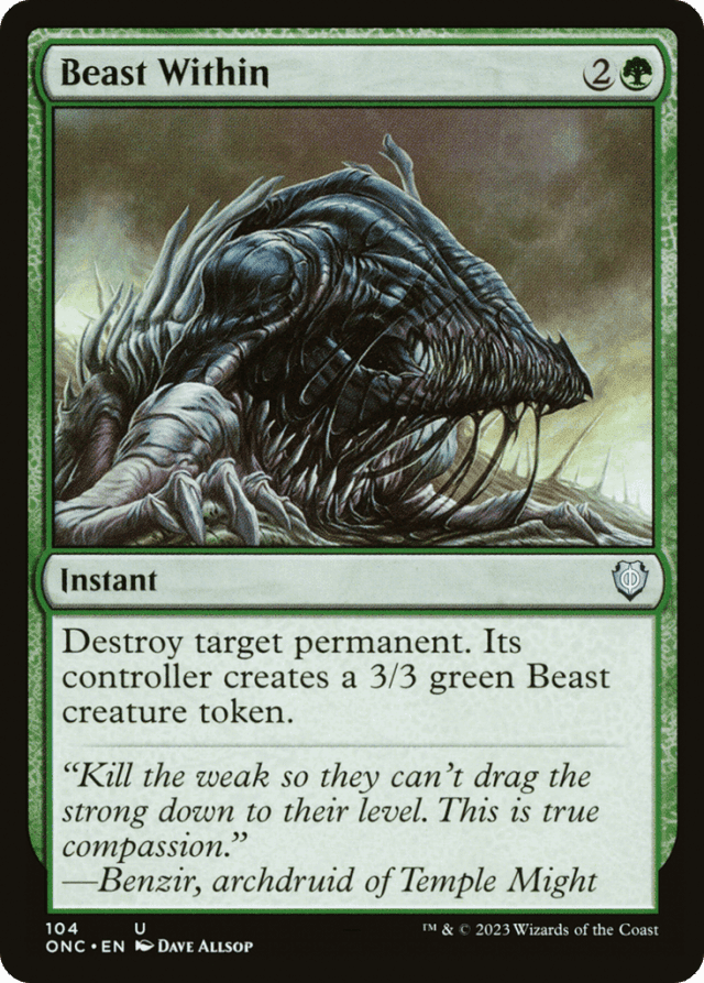 Destroy target permanent. Its controller creates a 3/3 green Beast creature token.