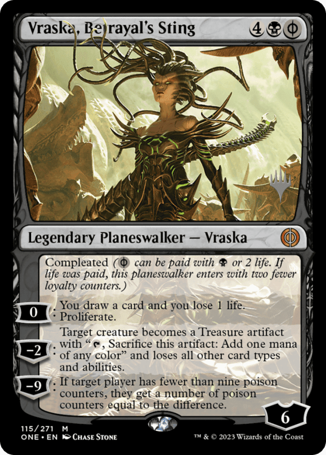 Compleated ({B/P} can be paid with {B} or 2 life. If life was paid, this planeswalker enters with two fewer loyalty counters.) [0]: You draw a card and you lose 1 life. Proliferate. [−2]: Target creature becomes a Treasure artifact with "{T}, Sacrifice this artifact: Add one mana of any color" and loses all other card types and abilities. [−9]: If target player has fewer than nine poison counters, they get a number of poison counters equal to the difference.